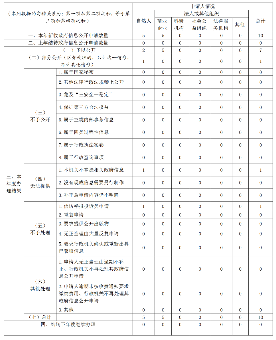 申请10单。通过咨询法律顾问、组织多部门会议等,加强与其他行政机关的沟通联系,确保公开信息的合法合规,所有申请均按规定时间依法办结答复。