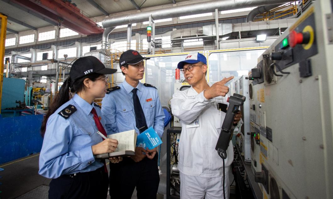 图为税务人员走访汽车零部件制造业企业,了解企业生产情况,宣传税费优惠政策。