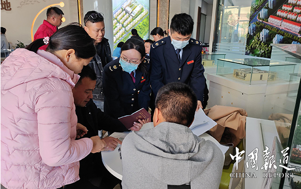 阳东区税务局青年志愿服务队到辖区内楼盘小区开展走房企、进小区活动,现场辅导业主办理契税(通讯员供图)