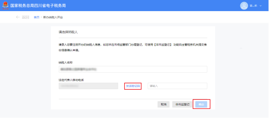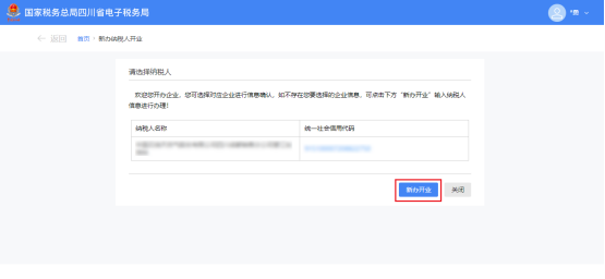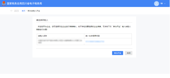 ①如果您为已在市场监管部门登记纳税人的法定代表人、财务负责人或授权代理人,则展示您作为法定代表人、财务负责人或授权代理人时,未进行税务登记的纳税人信息。并进行相应提示:“欢迎开办企业,您可选择对应企业进行信息确认。”点击拟开业纳税人的统一社会信用代码。