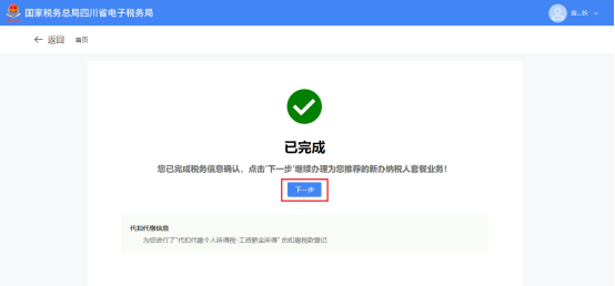 ③系统跳转已完成界面,并提示:“您已完成税务信息确认,点击‘下一步’继续办理为您推荐的新办纳税人套餐业务!”。点击【下一步】。