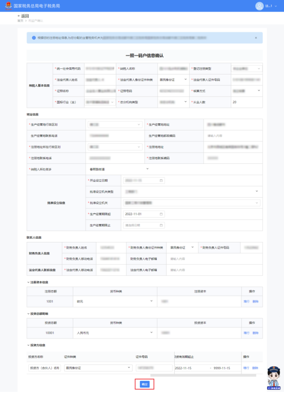 ③系统跳转信息确认界面,系统根据注册信息自动为其分配主管税务机关及所属分局,并提示:“根据您的注册地址信息,为您分配的主管税务机关为XXX税务局XXXX分局”,点击【确定】。