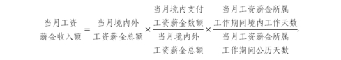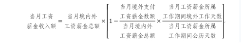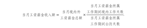 在一个纳税年度内,在境内累计居住不超过90天的非居民个人,仅就归属于境内工作期间并由境内雇主支付或者负担的工资薪金所得计算缴纳个人所得税。当月工资薪金收入额的计算公式如下(公式一):