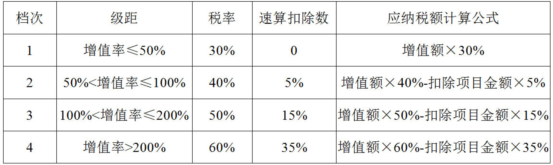 3.土地增值税增值额=房地产转让收入-扣除项目金额,增值率=增值额/扣除项目金额×100%,根据增值率确定使用税率,税率表如下: