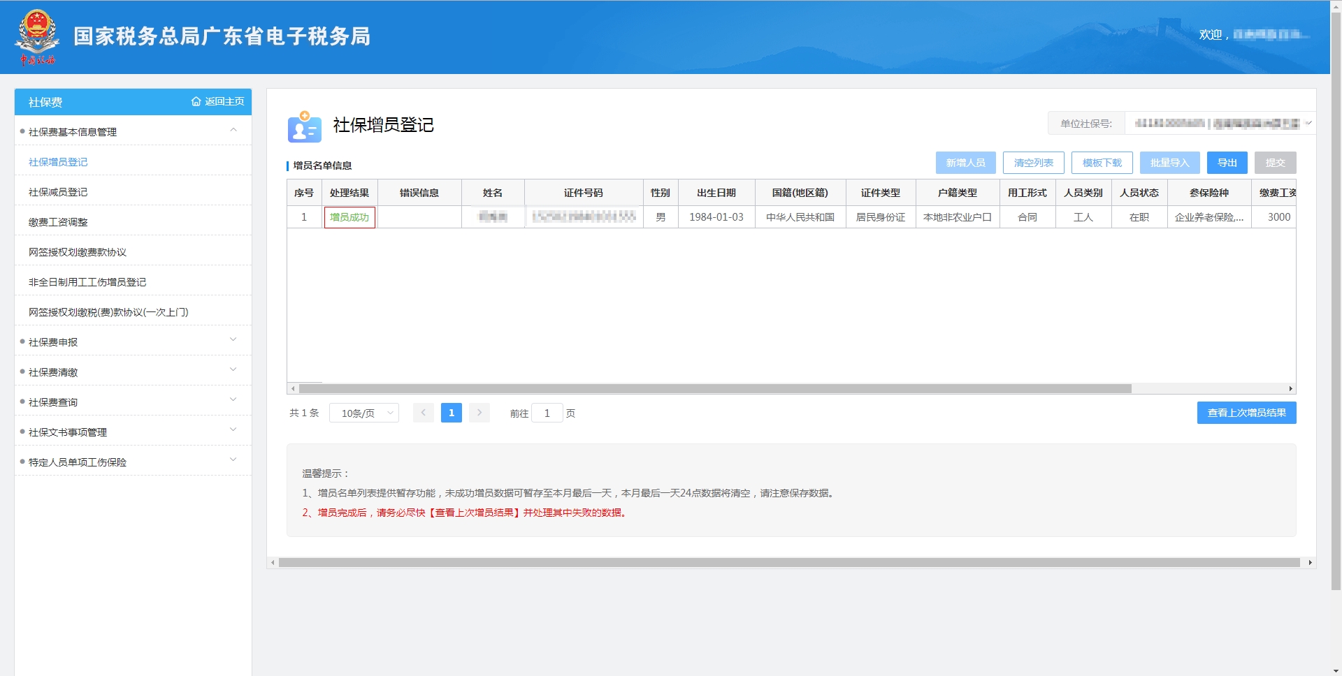 功能位置:广东省电子税务局【我要办税】【税费申报及缴纳】【社保费管理】->【社保费基本信息管理】【社保增员登记】