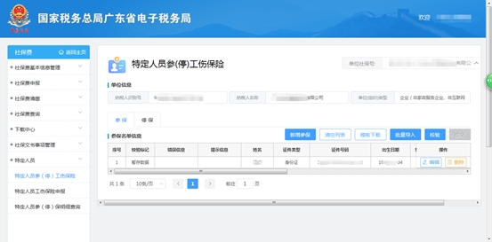 进入方式:企业身份登录电子税务局→【我要办税】→【税费申报及缴纳】→【社保费管理】→【特定人员】-【特定人员参(停)工伤保险】,进入特定人员参(停)工伤保险界面。