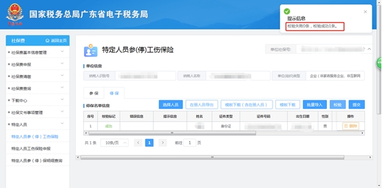 (3)点击【校验】,系统校验【停保名单信息】的人员信息,若全部校验成功,返回提示:“校验失败0条,校验成功XX条。”