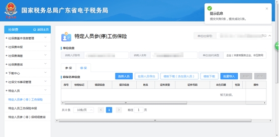 (1)点击菜单【特定人员参(停)工伤保险】模块功能,进入特定人员参(停)工伤保险界面;点击【模板下载】按钮下载空模板,录入新增参保人员。