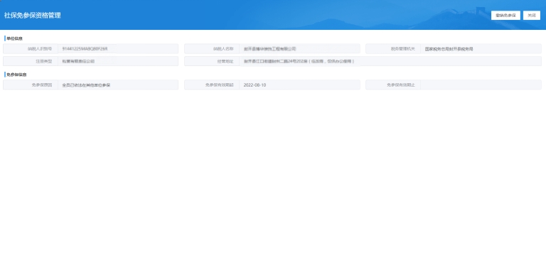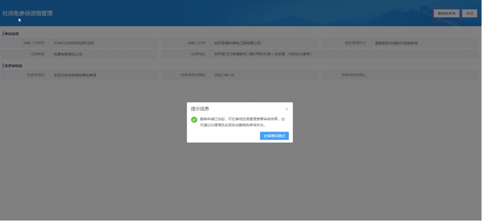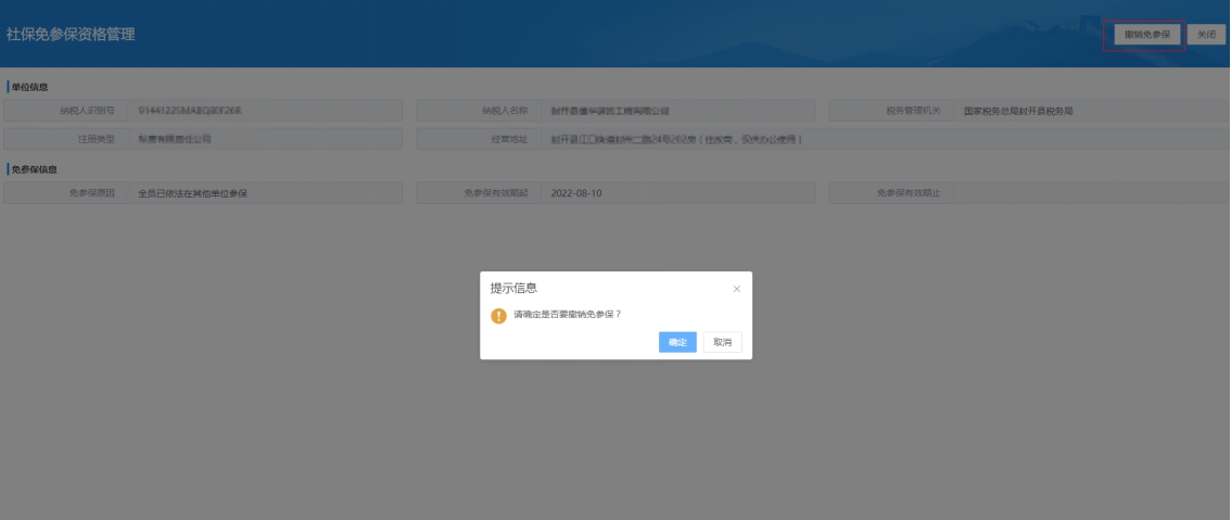 (1)免参保户点击【社保免参保资格管理】,进入撤销页面,显示单位信息、免参保信息。