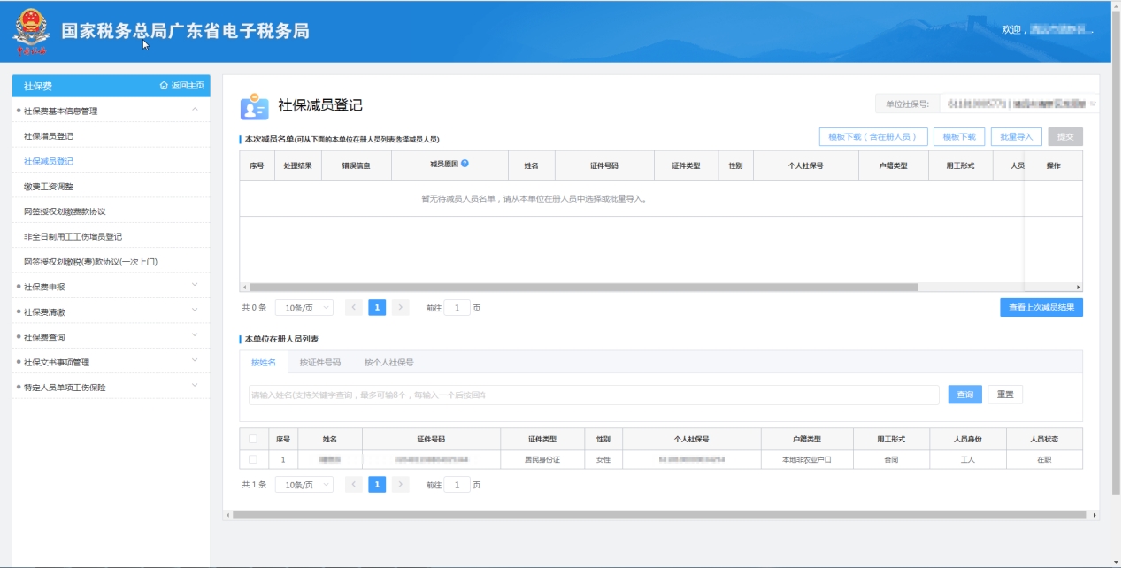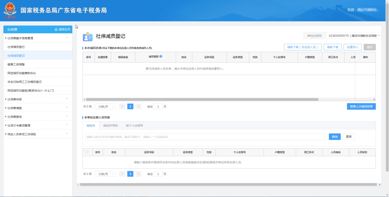 功能位置:广东省电子税务局->【我要办税】->【税费申报及缴纳】->【社保费管理】->【社保费基本信息管理】->【社保减员登记】