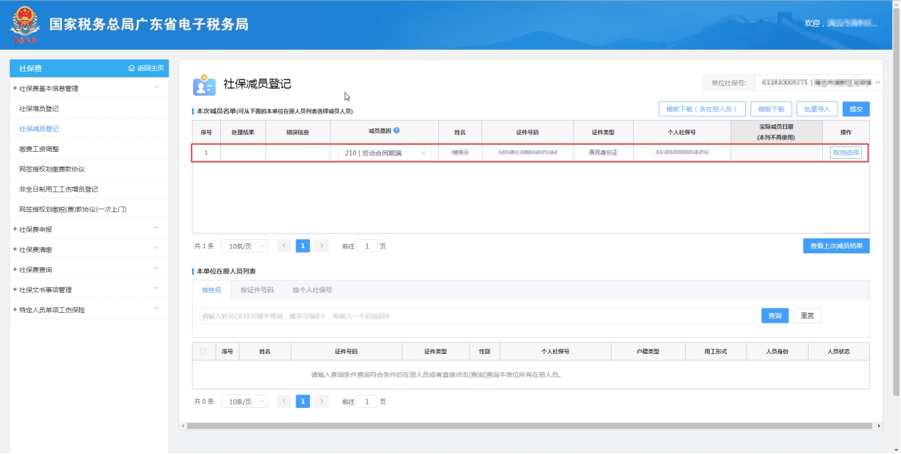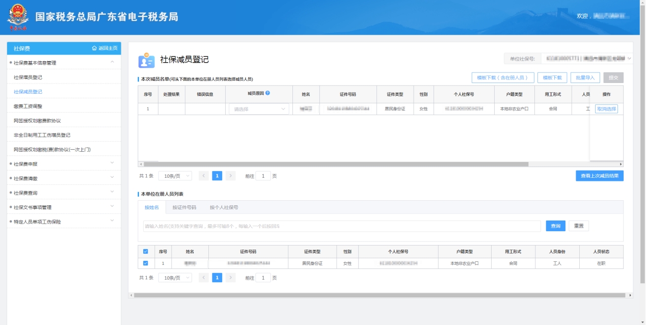 (3)在【本单位在册人员列表】勾选需要减掉的人员信息,勾选后在【本次减员名单】显示勾选的待减员信息。