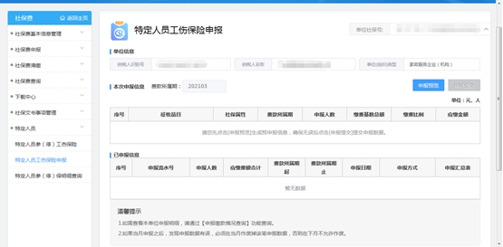 1. (1)点击菜单【特定人员工伤保险申报】,进入特定人员工伤保险申报界面;