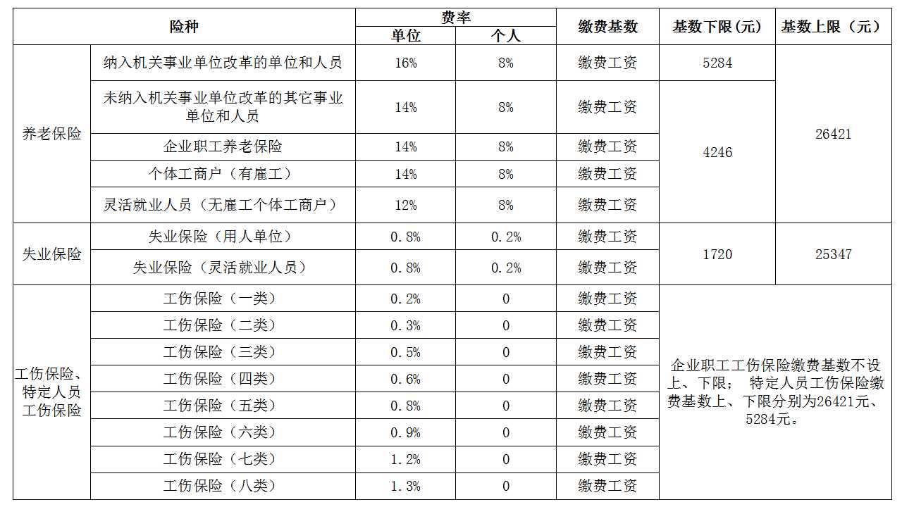 根据《关于公布2022年全省全口径城镇单位就业人员月平均工资和2023年职工基本养老保险缴费基数上下限有关问题的通知》及相关规定,自2023年7月1日起,我市社会保险费各险种征缴费率费基按下表执行。