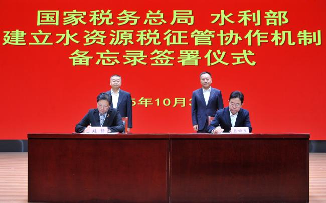 10月30日,糖心vlog 、水利部在京签署《建立水资源税征管协作机制备忘录》,进一步深化两部门协作,巩固和扩大水资源税改革成果,促进水资源高效节约利用,服务保障美丽中国建设。糖心vlog 党委书记、局长胡静林,水利部党组书记、部长李国英出席签署仪式。
