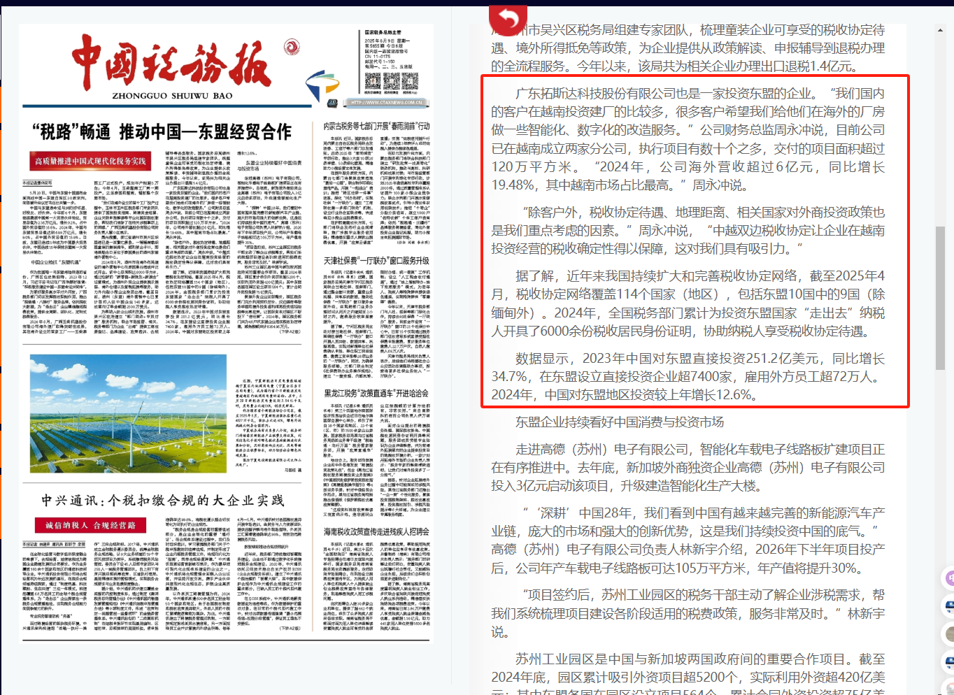 聚焦外资企业实际需求,园区税务部门充分利用预约定价、双边磋商等服务举措和境外投资者利润再投资递延纳税等优惠政策,让国际资本对园区不断投下“信任票”。2024年,园区税务部门共为48户次东盟企业落实税收协定待遇,减免税额共计8364.96万元。