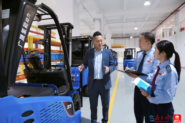 图为税务干部主动走进制造业企业,宣传税费优惠政策。(何秋霞 摄)