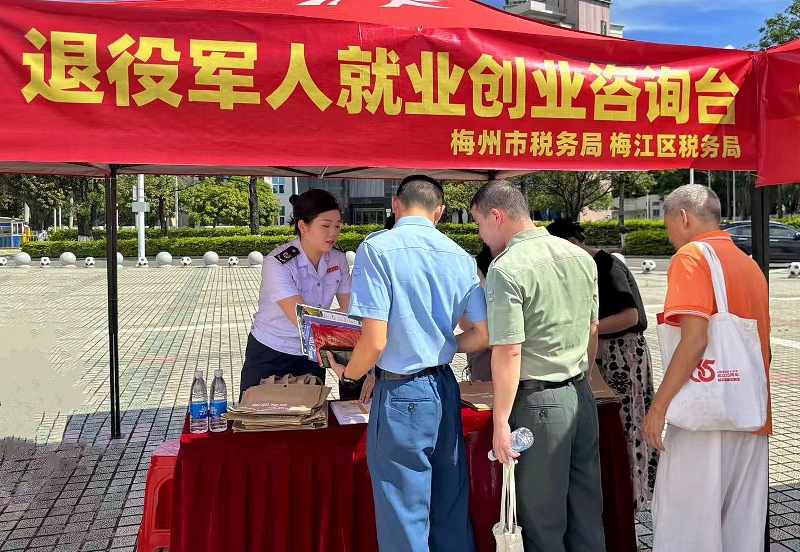 政策服务不止于课堂,更延伸至招聘一线。在退役军人暨军嫂专场招聘会上,由市、区两级税务部门联合设置的“退役军人税收政策咨询台”前人头攒动。“梅江·税云通”税务工作人员现场发放政策指引,并就退役军人提出的个性化涉税问题一一作出解答。