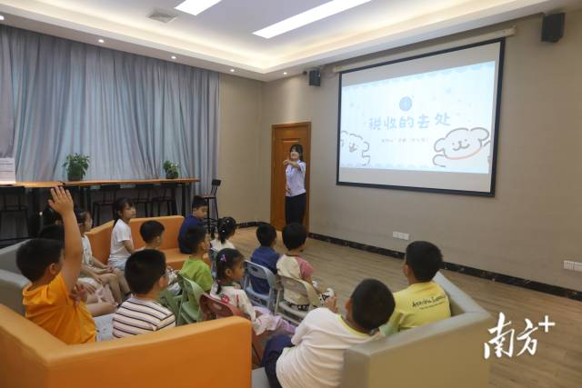 在税收普法小课堂上,税务青年化身“税务讲师”,以“税”字由“禾”字和“兑”字组成为切入点,为孩子们带来生动一课。通过故事与案例相结合的方式,税务青年深入浅出地讲解了税收的来源、用途以及青少年力所能及的贡献。