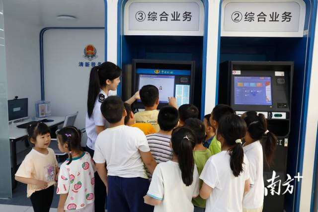 当来到自助终端机前,税务人员形象地介绍“这台机器可以打印每个人的‘税收成绩单’,记录着为国家贡献的力量”时,孩子们的好奇心被点燃,并在指导下亲身体验了这份“成绩单”诞生的过程。