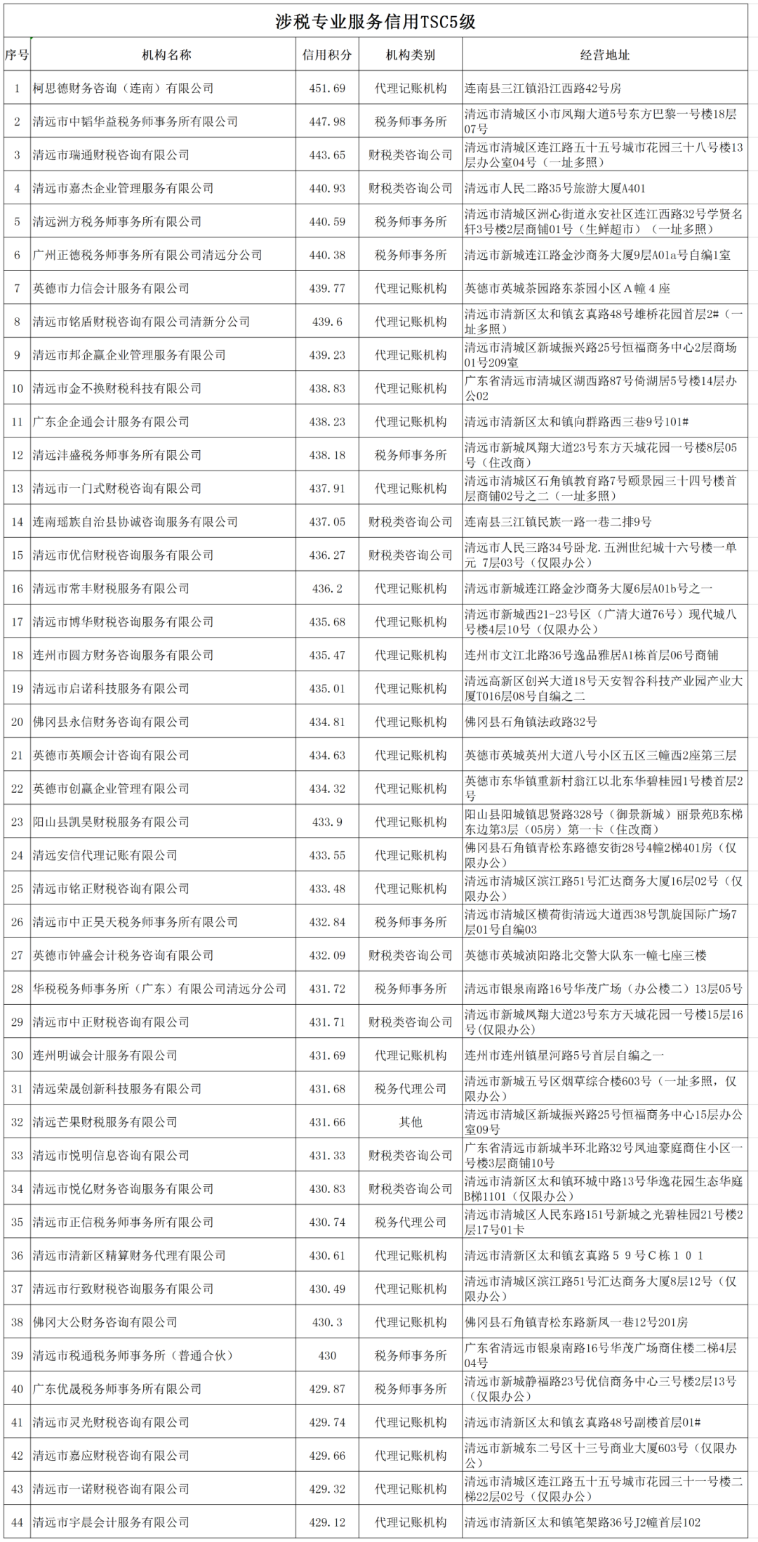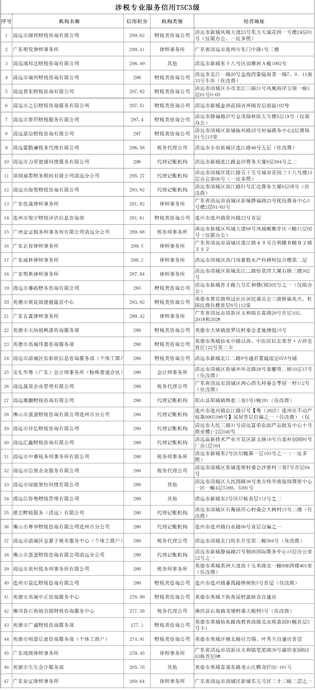 为加强涉税专业服务信用评价管理工作,促进涉税专业服务行业健康发展,根据《涉税专业服务管理办法(试行)》(糖心vlog 令第58号)规定,现将清远市2025年10月涉税专业服务机构信用等级和信用积分情况予以发布。