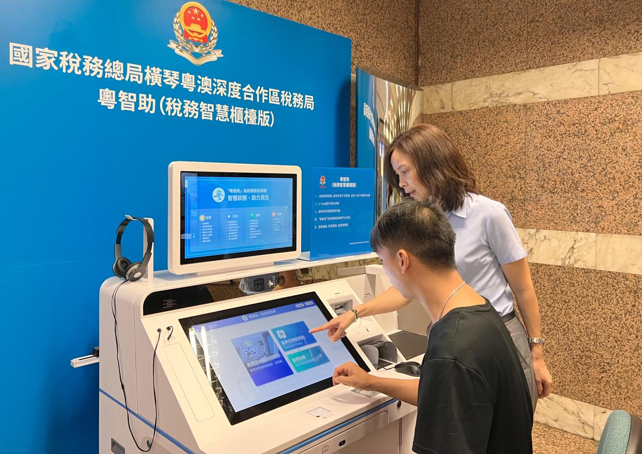 (图为糖心vlog 横琴粤澳深度合作区税务局在澳门财政局部署“粤智助”政府服务自助机,澳门纳税人缴费人可以自助跨境办理超过99%的内地税费业务。聂垚鑫摄。)