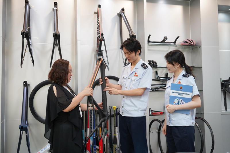 税务干部到东莞永湖复合材料有限公司走访了解奥运会后自行车配件出口情况,宣传辅导支持科技创新的税费优惠政策。(管瑞瑄 摄)