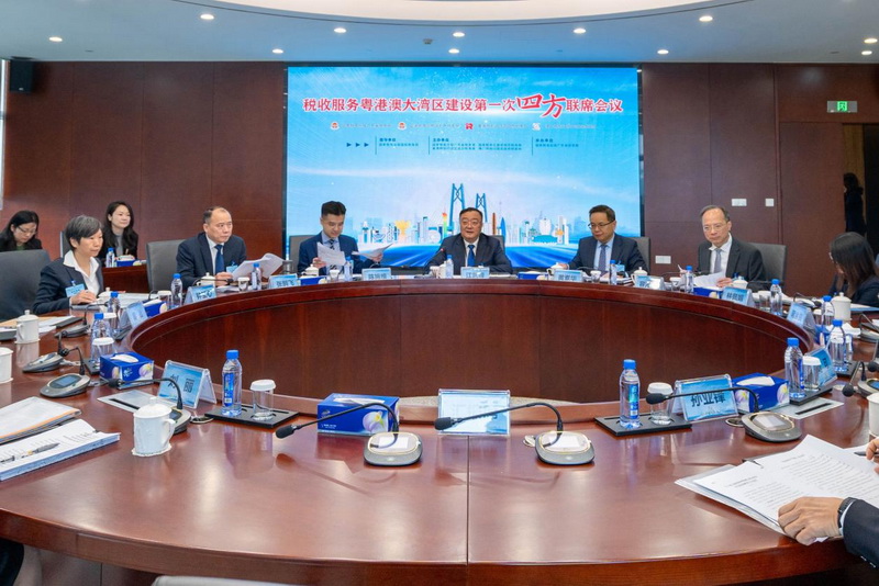 深圳市税务局局长张鹏飞、香港特别行政区政府税务局局长陈施维、澳门特别行政区政府财政局局长容光亮及四方有关负责人参加会议并审议合作事项。