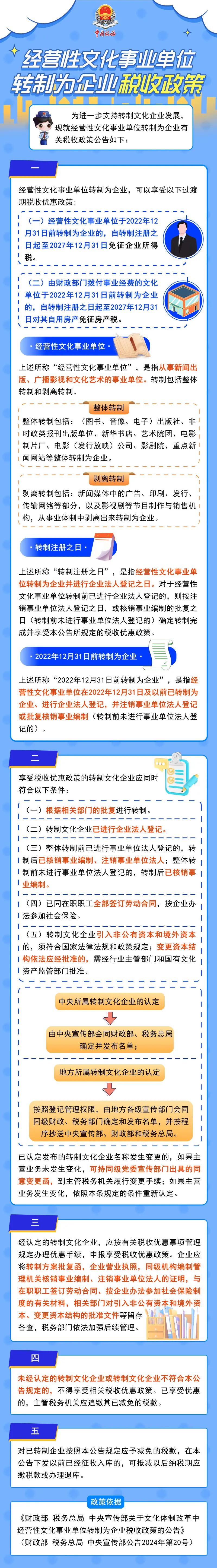 财政部 税务总局 中央宣传部关于文化体制改革中经营性文化事业单位转制为企业税收政策的公告 (财政部 税务总局 中央宣传部公告2024年第20号 )