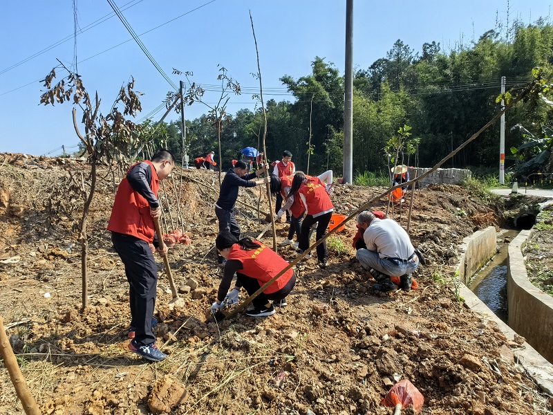 植树现场,大家热情高涨,积极行动,挥锹挖坑、扶正树苗、压实回填、提水浇灌,分工协作,各司其职。在大家的共同努力下,共栽下具有较高经济价值的荔枝、龙眼等树苗100株,具有较高观赏价值的枫树、桂花、紫花风铃木等树苗600多株。
