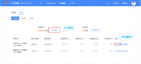 【注意】合伙企业的每个投资者都要分别自行申报! 3.完成申报后,点击【申报管理】→【已申报】→【未完成】,点击对应申报项目的【立即缴税】进行缴税,如有多条未缴款记录可点击待缴税款右边的【立即缴税】(仅同一个税款所属机关、收款国库的申报可合并缴税),完成税款缴纳,如下图示 |