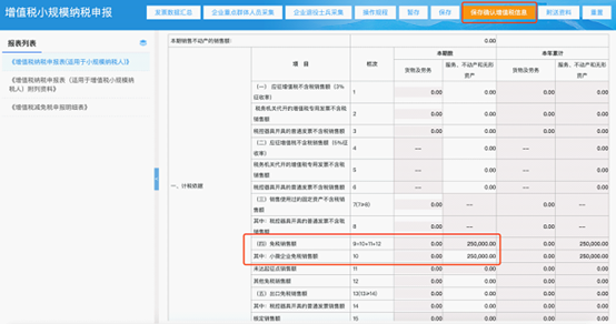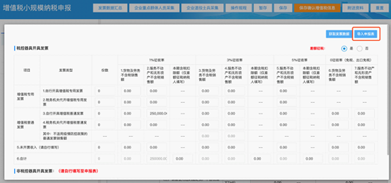 7.增值税申报,点击“填写申报表”,进入增值税申报表,在这里,我们以小规模纳税人为例,通过发票数据汇总页,将当月开具发票信息一键导入申报表后,点击“保存确认增值税信息”,保存成功后,点击“返回合并申报”