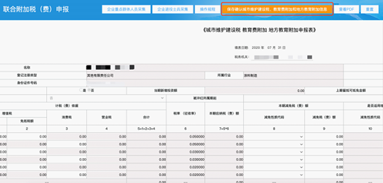 8.附加税(费)申报,点击“填写申报表”,进入附加税(费)申报表,确认增值税及消费税附加税(费)信息后,点击“保存确认城市维护建设税、教育费附加和地方教育附加信息”,保存成功后,点击“返回合并申报”