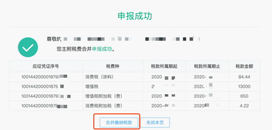 11.您可选择点击“合并缴纳税款”进行税款缴纳,这样主附税费合并申报缴税就完成啦