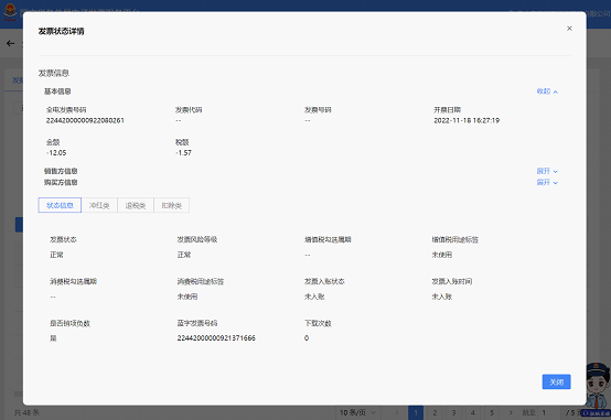 点击操作栏的【详情】按钮,可查看盖章发票的状态、勾选属期、增值税标签等信息。