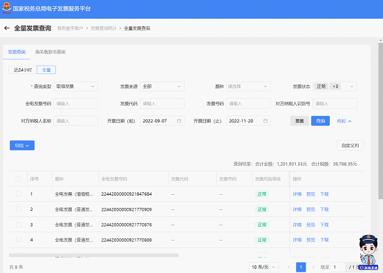 (一)可通过该功能查询取得的发票,进行查看详情、发票预览、下载等操作。