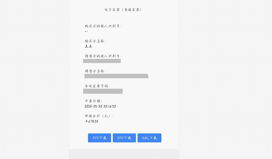 扫描二维码后自动跳转发票下载界面,共有PDF、OFD和XML三种格式供选择,直接点击对应格式的下载按钮即可对发票进行下载。