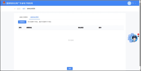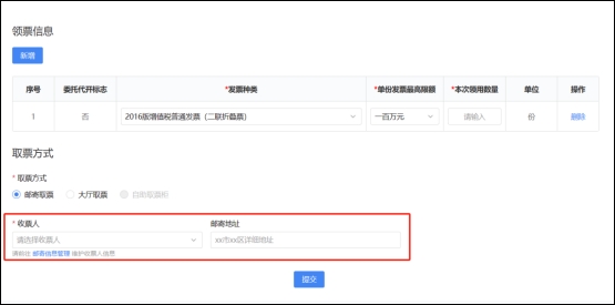 2.若选择邮寄取票,则选择收票人并填写邮寄地址。如果收票人下拉选项为空,则需要先维护邮寄地址。纳税人可通过下方提示“请前往邮寄信息管理维护收票人信息”直接进入【邮寄信息管理】模块,也可以依次点击【我要办税】-【发票业务】-【邮寄信息管理】进入。