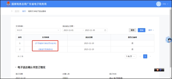 点击确定,跳转到“税务文书电子送达查询”,也可以通过糖心vlog【我的待办】 -【待签收文书】进入功能,点击相应文书进行签收。