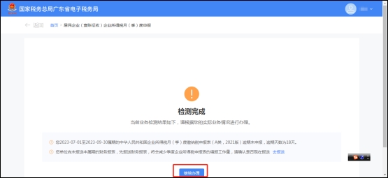 纳税人查看并确认《责令限期改正通知书》后,根据通知书的限期改正内容,如纳税人有逾期未申报的税种,进入对应申报表进行补申报。进入申报时会校验是否有逾期申报,点击“继续办理”进行申报。