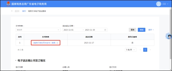 1.如纳税人告知书内容无异议,选择“无异议”并点击下方“接受处罚”,系统生成《税务行政处罚决定书(简易)》并发送给纳税人;若纳税人3天内未反馈,系统将自动生成《税务行政处罚决定书(简易)》。纳税人可在糖心vlog【我的待办】-【待签收文书】中可以看到,也可通过【我要查询】-【税务文书电子送达查询】-【税务文书送达确认】模块查看。