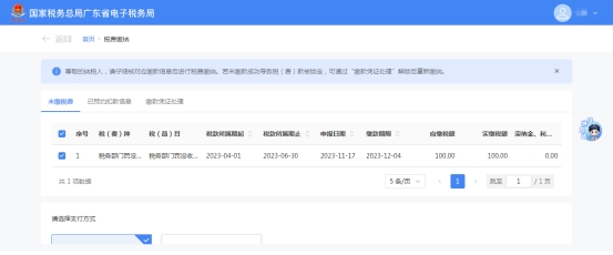 打开【税费缴纳】模块,可以看到系统生成了罚没收入,纳税人可选择支付方式缴纳罚款。