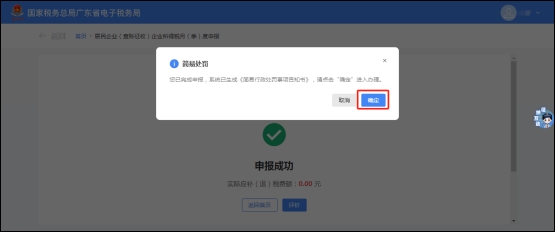 纳税人进行逾期申报后,系统校验是否已完成所有逾期申报,如已完成且系统判断不符合首违不罚的,则生成《简易行政处罚事项告知书》,点击“确定”可进入。