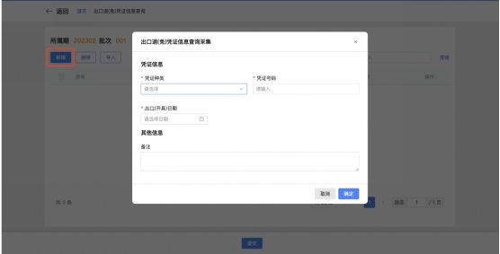 如纳税人需采集凭证信息数量较少,可点击【新增】,根据系统提示依次录入凭证种类、凭证号码、出口(开具)日期等信息,完成数据采集。