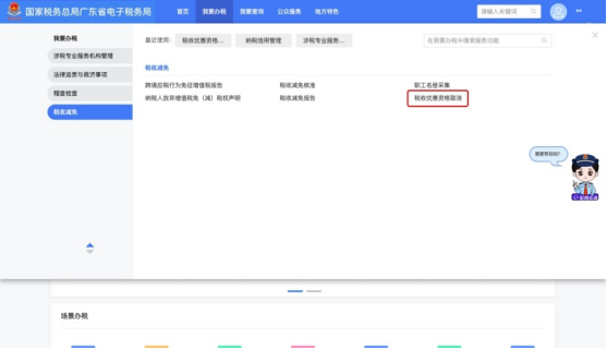 (一)登录新电子税务局后,点击【我要办税】-【税收减免】-【税收减免】-【税收优惠资格取消】功能菜单。