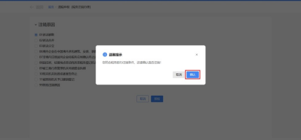 1.系统提示纳税人符合税务注销申请条件(如下图),点击【确认】则可立即提交注销申请,税务机关在规定期限内完成审核。纳税人可通过【我要查询】-【办税进度及结果信息查询】查询办理进度。