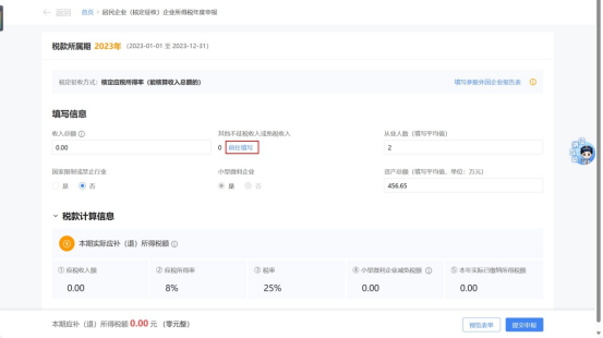 1.若纳税人为按核定应税所得率(能核算收入总额的)系统会根据同期财务报表或发票信息自动预填收入总额、从业人数、资产总额等,若与实际情况不符,可直接进行修改。若纳税人未报送同期财务报表的,需纳税人自行填写数据。如需填报不征税收入或免税收入事项,可点击“其他不征税收入或免税收入”的【前往填写】,进行填报。