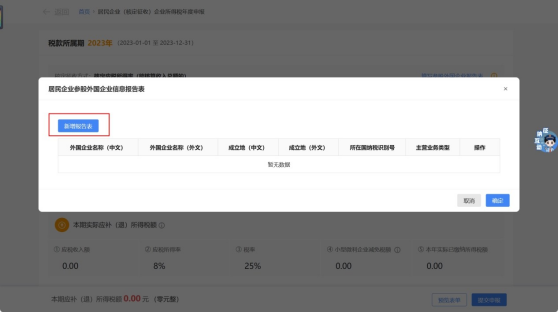 如企业需填报《居民企业参股外国企业信息报告表》,可点击右上角【填写参股外国企业报告表】跳转界面,再点击【新增报告表】进行填报。