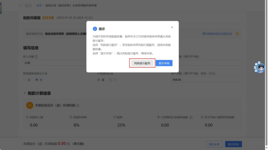 纳税人完成申报表填写后,点击【提交申报】,系统提示是否需要进行风险扫描,纳税人可点击【风险提示服务】进行风险扫描,提高申报数据质量,也可直接点击【提交申报】。