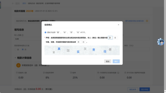 选择【风险提示服务】,系统会自动进行数据风险扫描,若存在风险疑点,纳税人可根据系统提示点击【修改表单】对数据进行修改。点击【继续申报】,会要求纳税人依次输入“真”“实”“责”“任”四个字,申报完成。