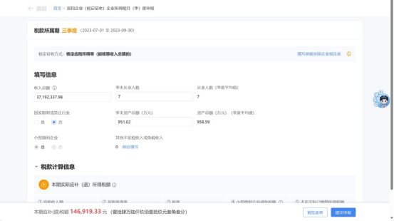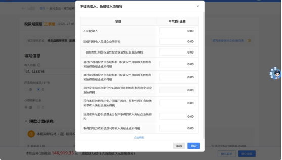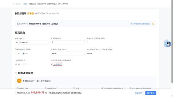系统会根据同期财务报表或发票信息自动预填收入总额、从业人数、资产总额等,若与实际情况不符,可直接进行修改。若纳税人未报送同期财务报表的,需纳税人自行填写数据。如需填报不征税收入或免税收入事项,可点击“其他不征税收入或免税收入”的【前往填写】,进行填报。